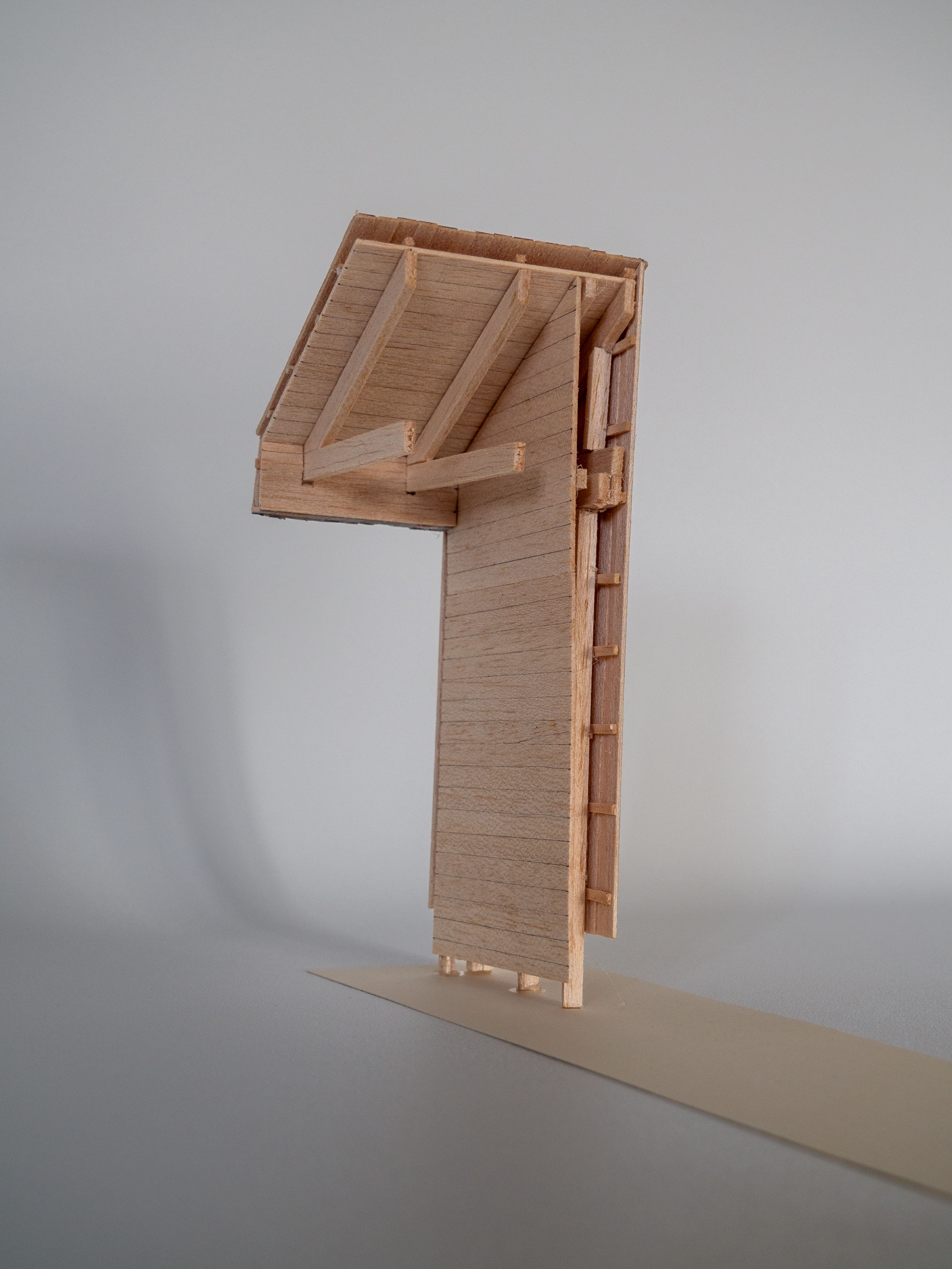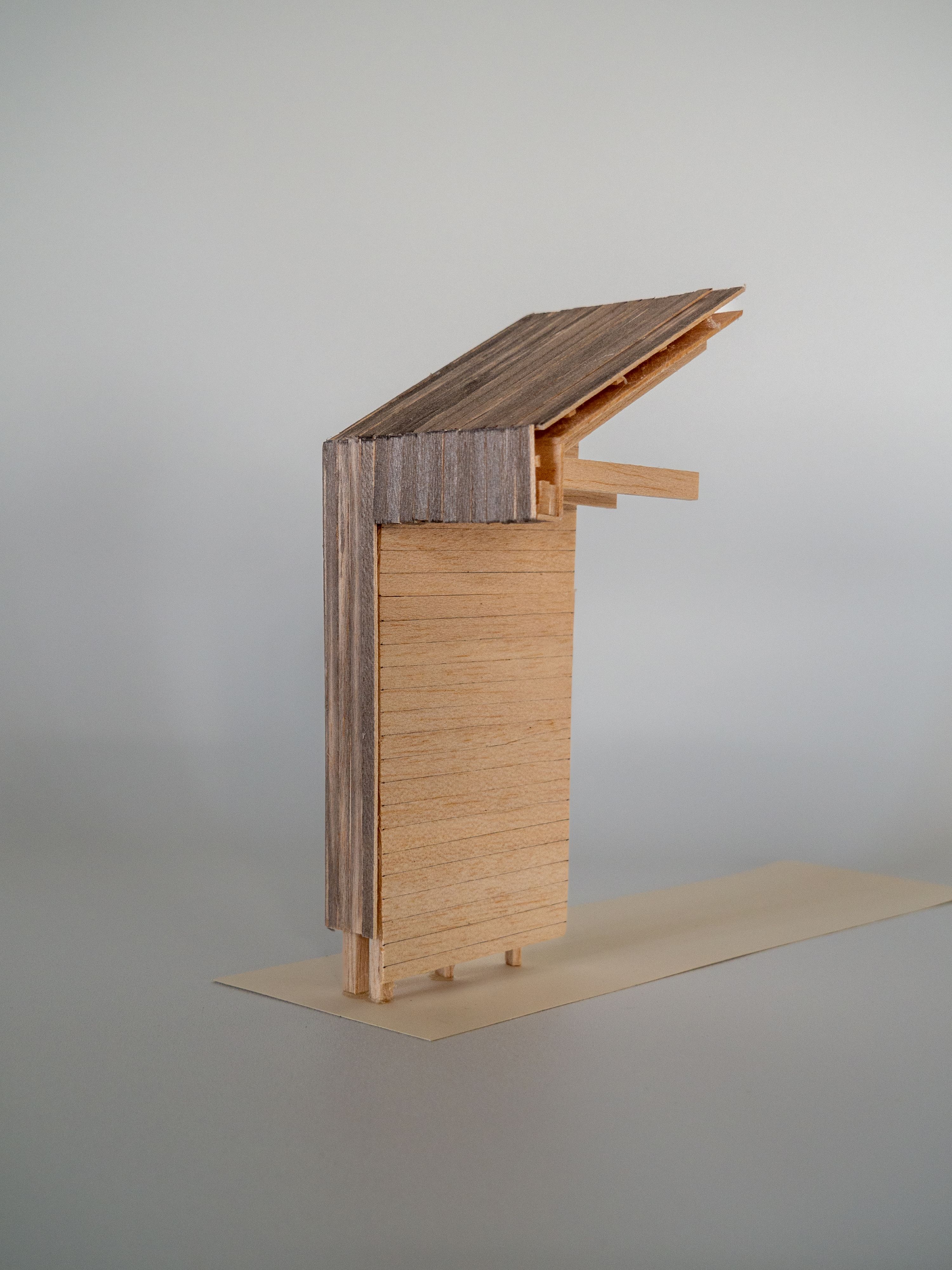 O design se inspira na tipologia do abrigo delta — uma forma triangulada simples que segue a inclinação do terreno e minimiza sua pegada. Revestida em madeira escura tingida, a adição se lê como uma extensão do chão da floresta, com sua silhueta angular ecoando o ângulo das copas das árvores ao redor.