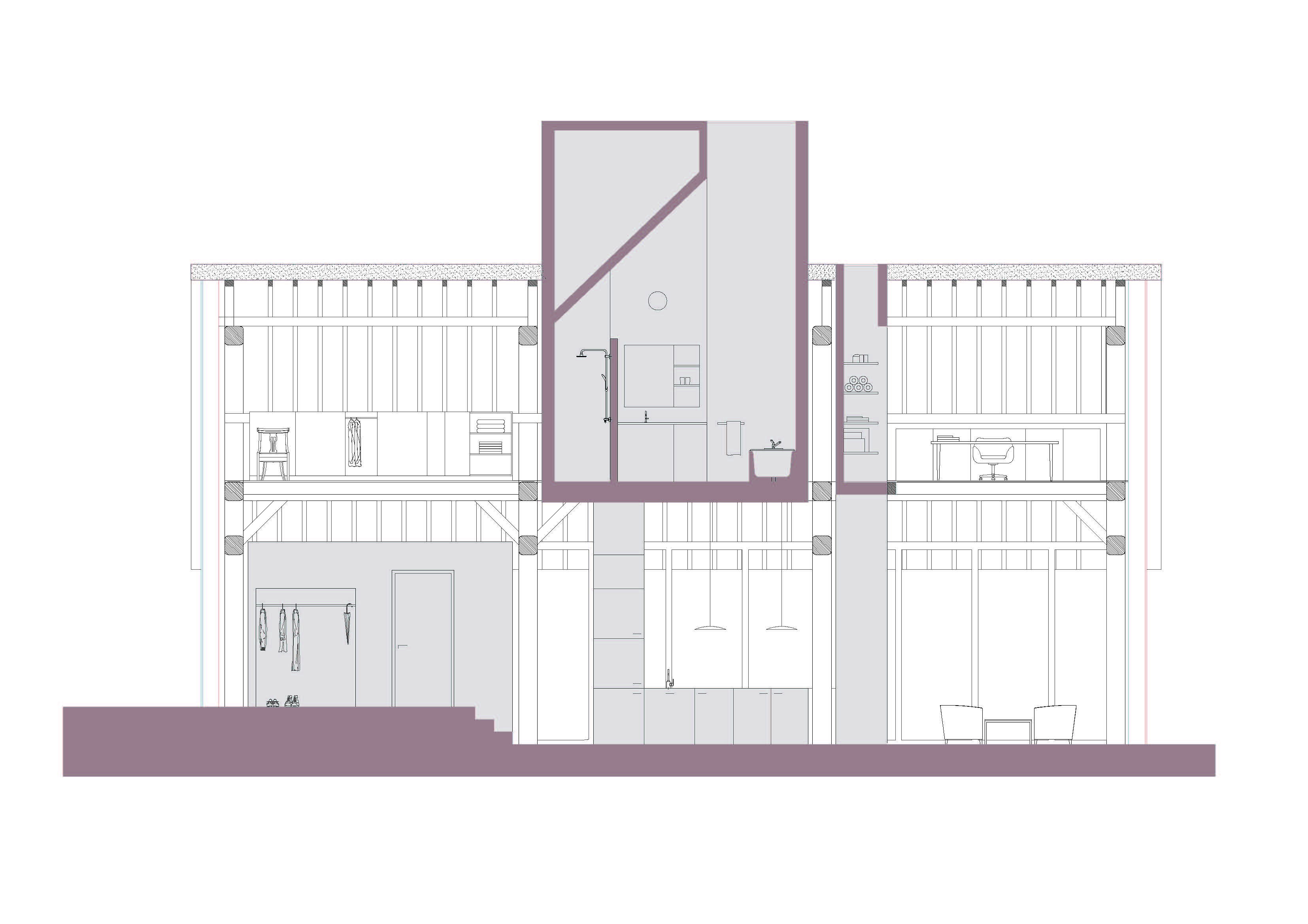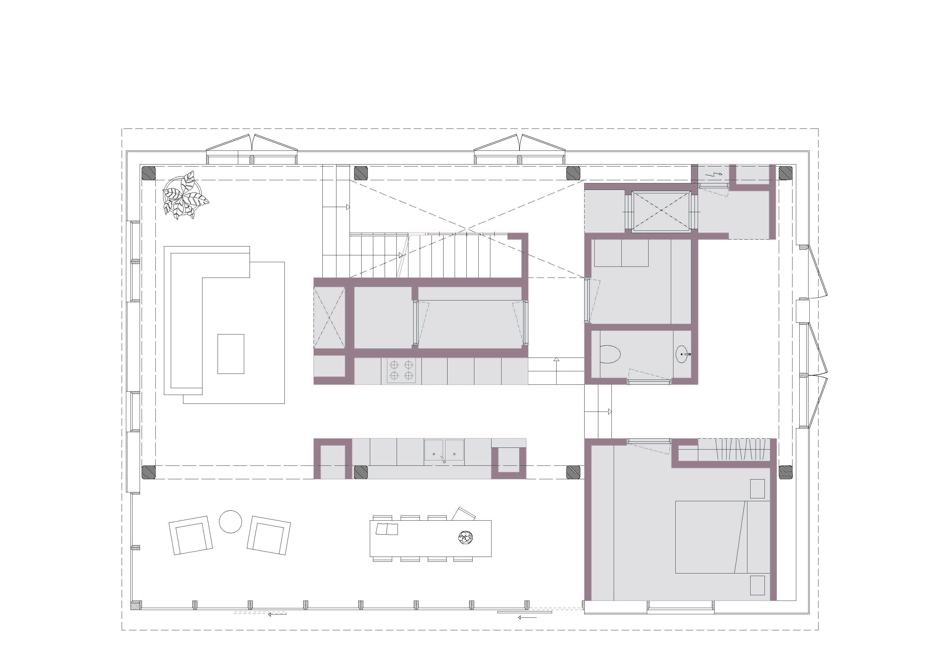 The barn had long been used as a garage and storage. Luckily, most of its wooden columns and beams were still intact, providing a framework for the transformation. Mieke's vision was to preserve as much of the existing structure as possible, allowing it to carry the light facade structure. In the centre of the home, a “hearth” would be established. This hearth would be the core of all the essential infrastructure of the home, the fireplace, the kitchen, the bathroom and the stairs to the second floor. This core became one of the main aspects of the concept, designed to rise through the sentre of the building allowing spaces to naturally emerge around it.