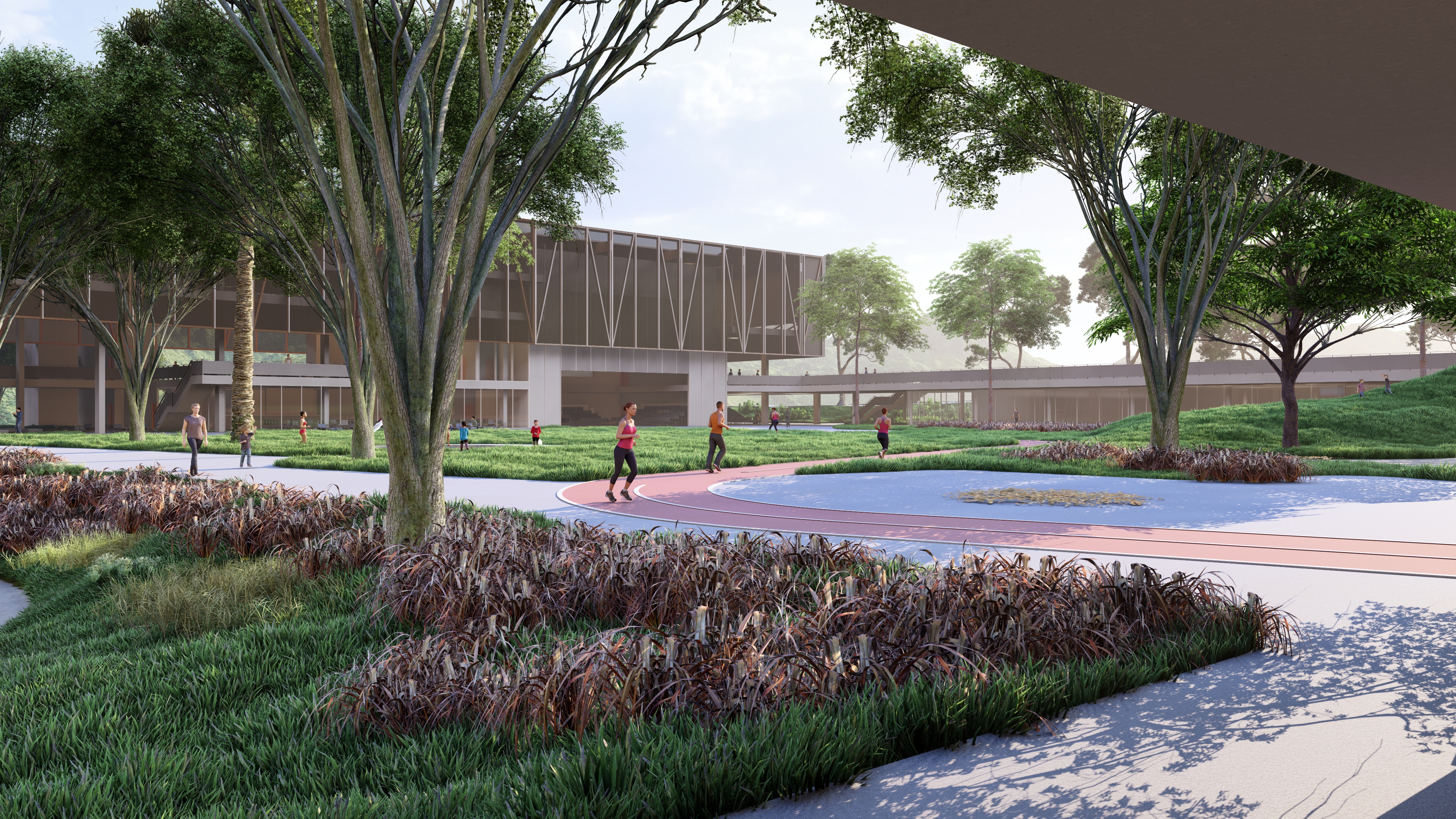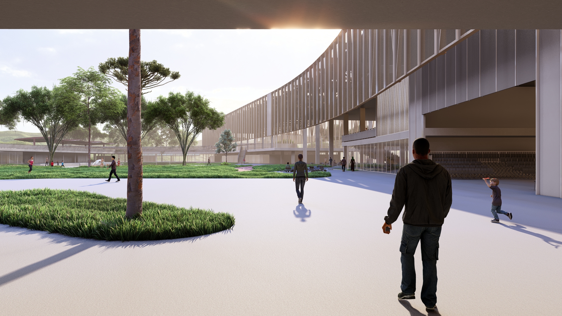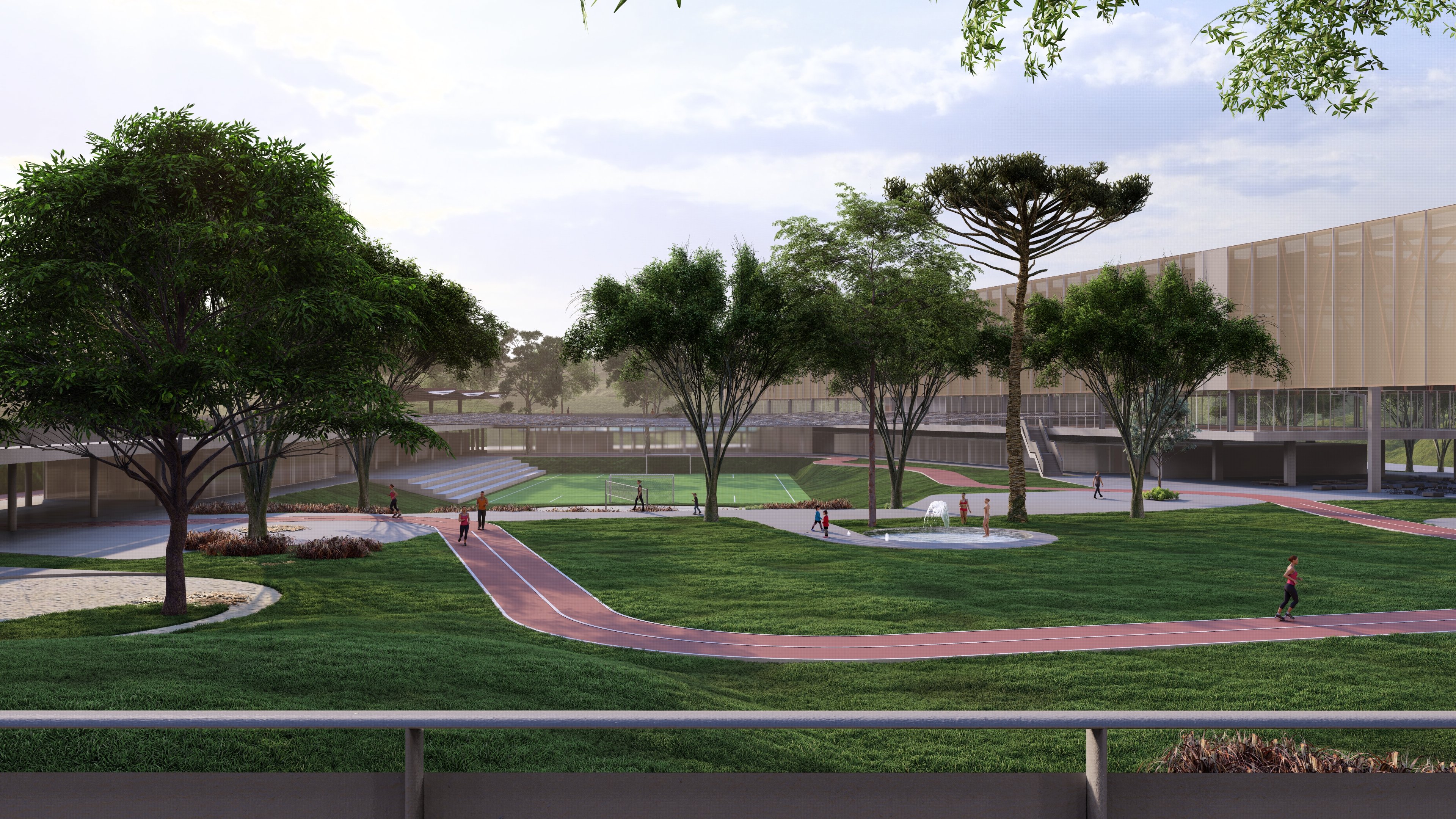 A 200 m–long curved pavilion along the eastern edge frames views toward the Serra, serving as a monumental backdrop to the park. Its gentle arc both envelops the green courtyard and frees a service yard to the east, where loading docks and technical towers are discreetly located. Within the pavilion, program is zoned into sociocultural functions - auditorium with independent foyer café, multipurpose rooms, library and children’s play - and sports amenities, including indoor courts, pools and fitness spaces.