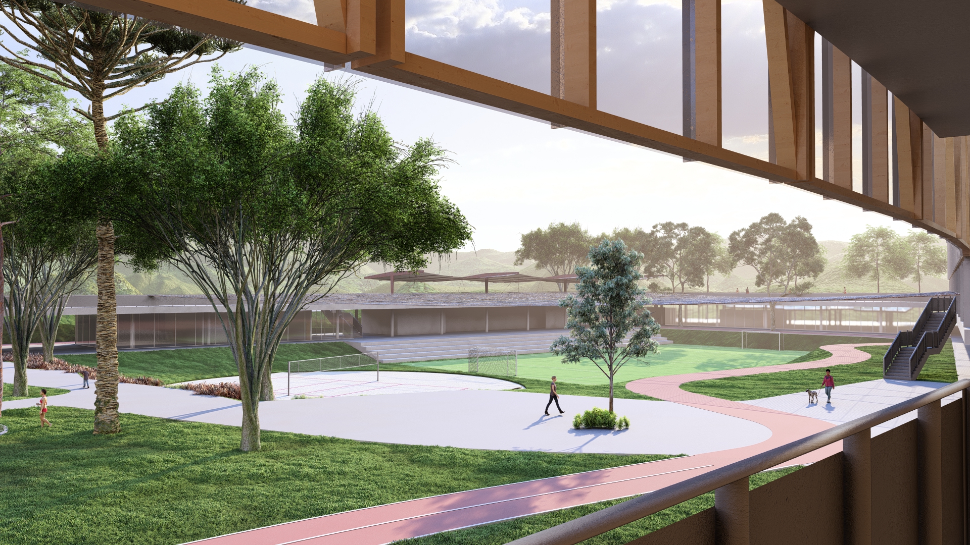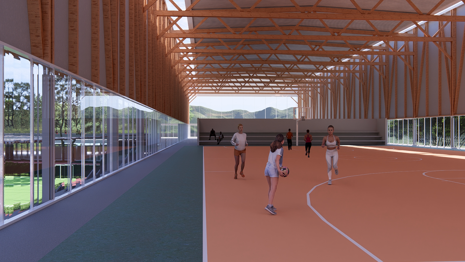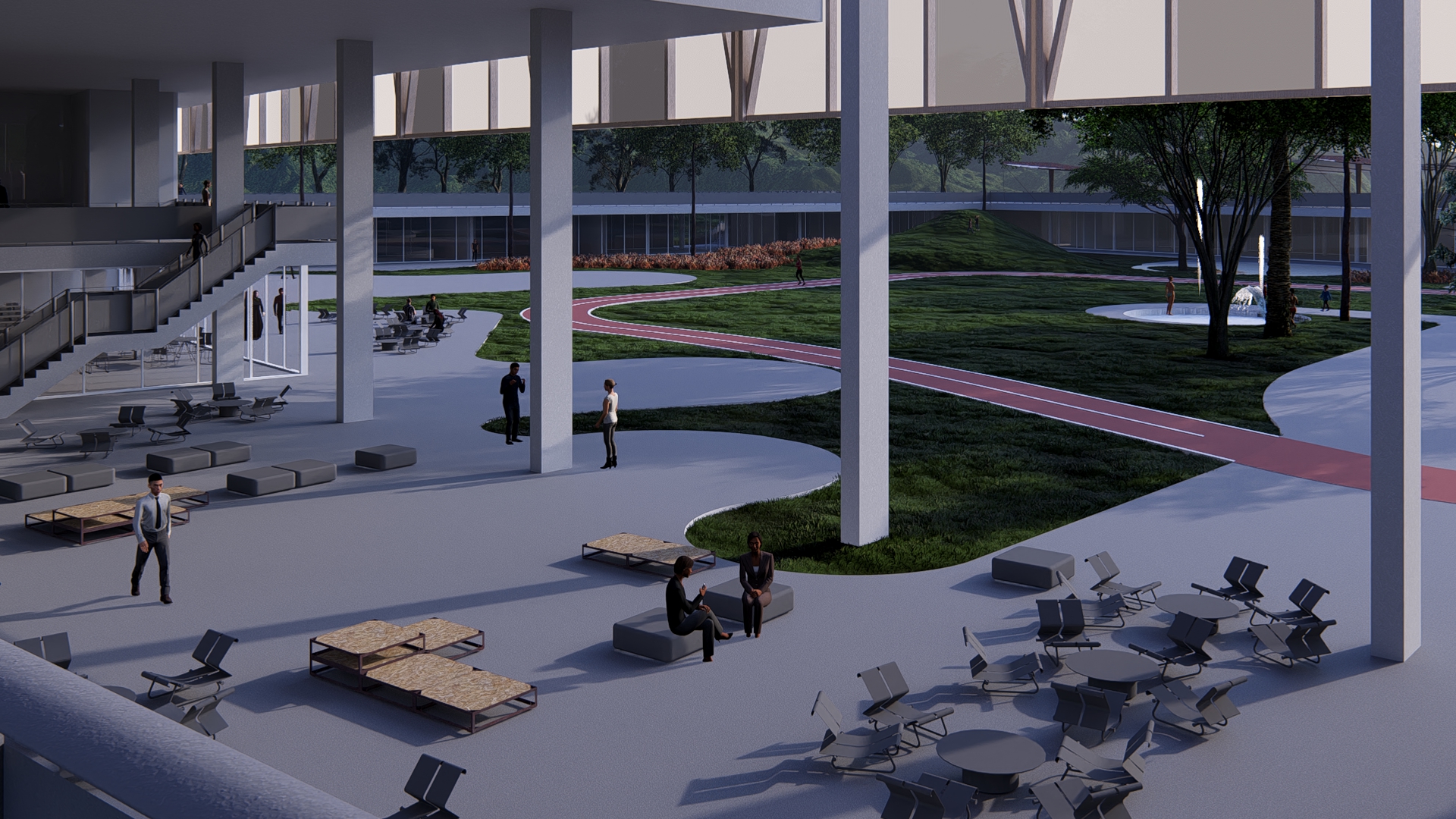 A 200 m–long curved pavilion along the eastern edge frames views toward the Serra, serving as a monumental backdrop to the park. Its gentle arc both envelops the green courtyard and frees a service yard to the east, where loading docks and technical towers are discreetly located. Within the pavilion, program is zoned into sociocultural functions - auditorium with independent foyer café, multipurpose rooms, library and children’s play - and sports amenities, including indoor courts, pools and fitness spaces.
